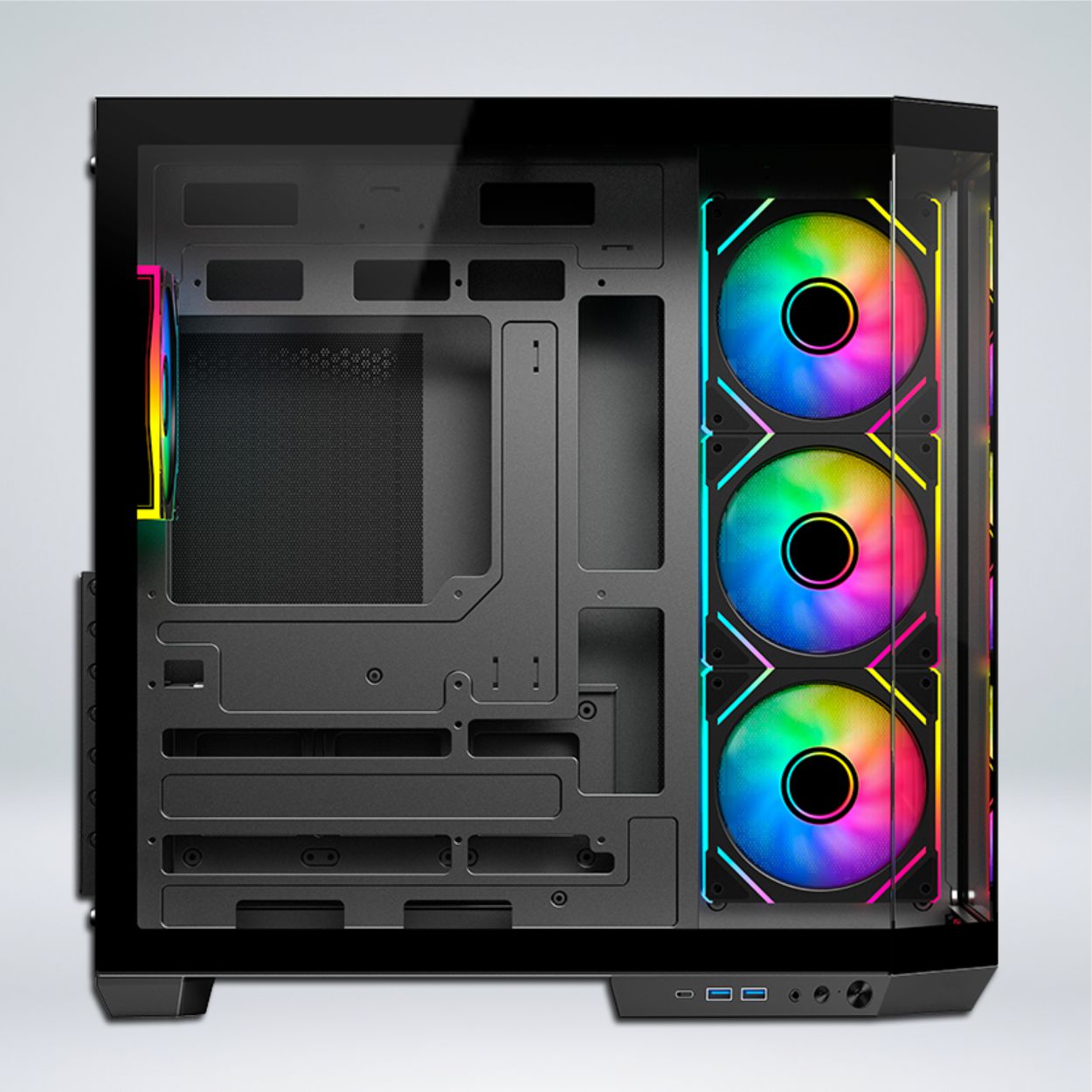 Es una caja para PC diseñada para quienes buscan un equipo con estilo y rendimiento. Está fabricado en un elegante color negro y cuenta con panel de vidrio templado que permiten mostrar el interior de tu equipo, dándole un aspecto moderno y sofisticado. Incluye cuatro ventiladores ARGB de 140 mm, que no solo ayudan a mantener una buena circulación de aire, sino que también ofrecen impresionantes efectos de iluminación personalizables para que puedas crear la estética que más te guste. Es una opción ideal para gamers y entusiastas que desean un gabinete con buen espacio, buena ventilación y un diseño llamativo.
