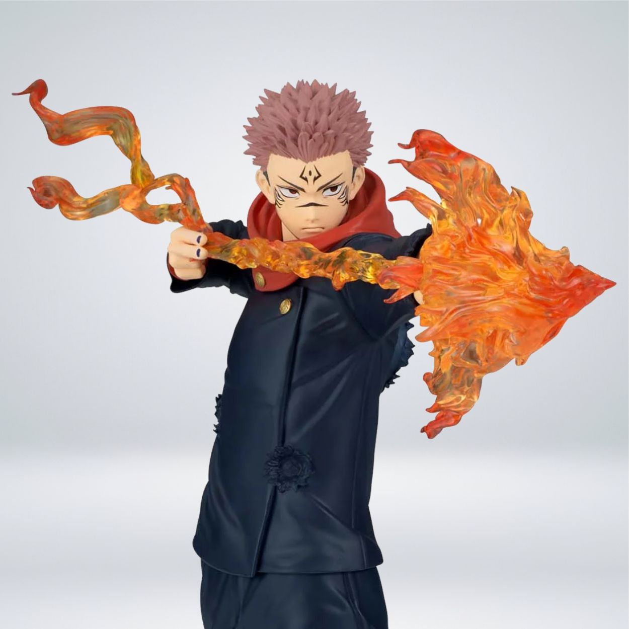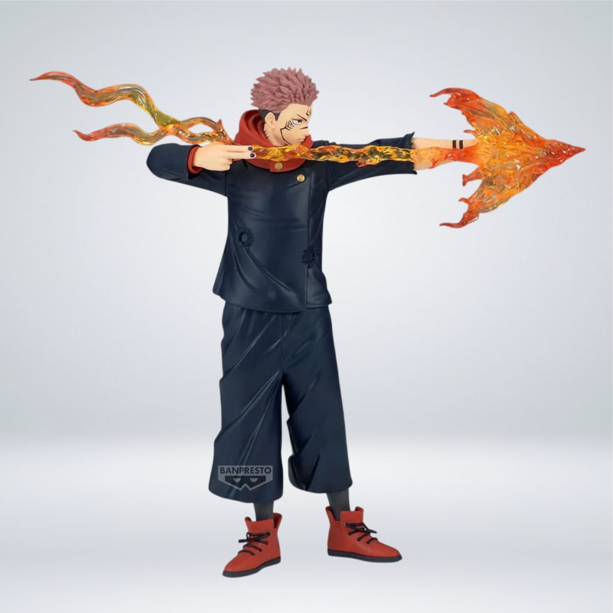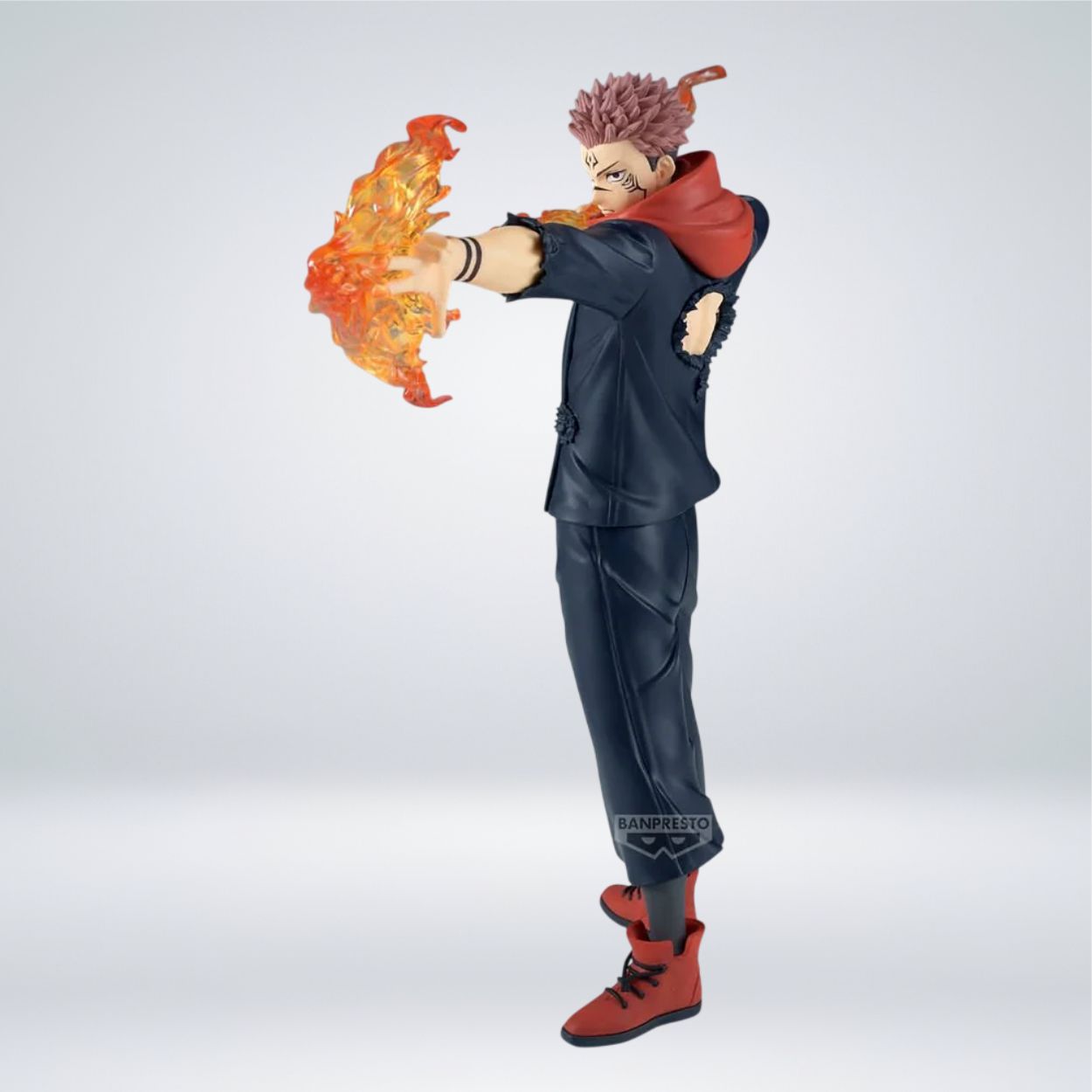 Esta pieza de colección de la línea Maximatic Plus de Banpresto (Bandai Namco) presenta a Sukuna, el Rey de las Maldiciones de la serie Jujutsu Kaisen, en una pose de combate sumamente dinámica mientras utiliza su técnica de flecha de fuego. La figura destaca por el uso de materiales traslúcidos en los efectos de las llamas, lo que aporta un realismo visual impresionante, junto con un esculpido detallado que captura fielmente la expresión amenazante del personaje y los pliegues de su atuendo. Fabricada en PVC y ABS de alta calidad, esta estatua tiene una altura aproximada de 21 centímetros (unas 8.3 pulgadas), consolidándose como una pieza de gran tamaño y presencia para cualquier fanático que busque inmortalizar el poder abrumador de Sukuna en su colección.