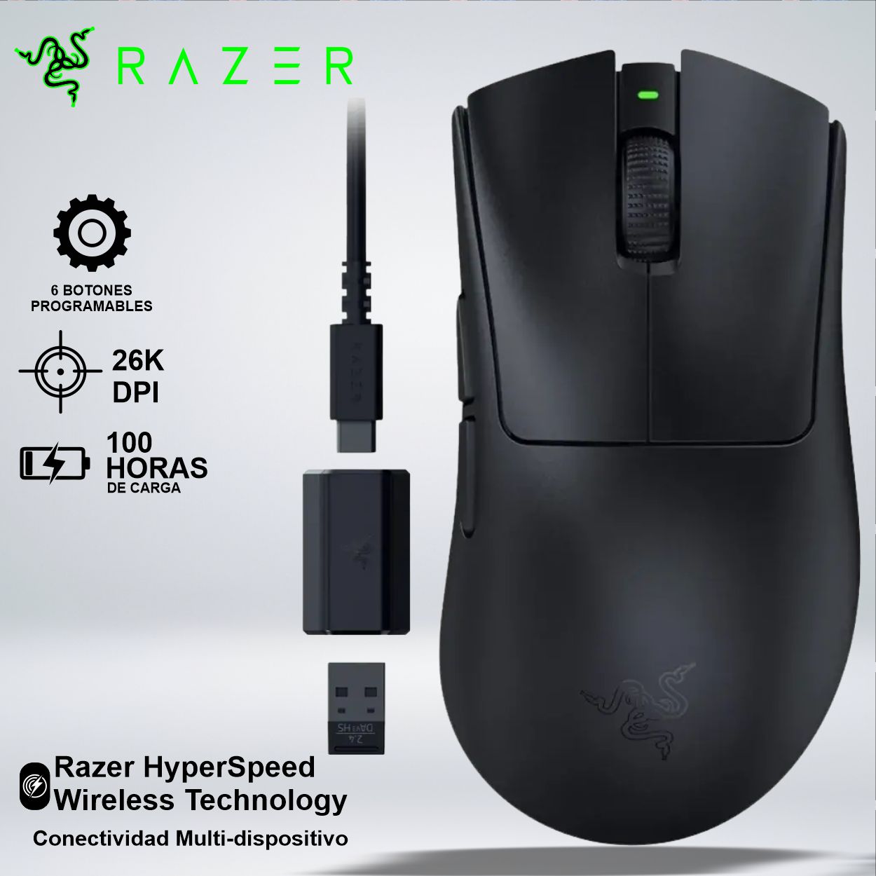 Hasta 33 horas con Razer HyperPolling Wireless Dongle y Mouse Dock Pro* (movimiento constante a 4000 Hz)